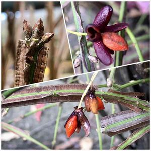 おはようございます😊 💠ニシキギ(錦木) 紅葉の美しさを「錦」にたとえ「錦木」と名がついた🍂🍂 古い枝の周囲にコルク質の風変わりな「翼」ができることで知られる。 この翼を刃物になぞらえ「カミソリノキ」などの別名がある。 その紅葉は終わっていて(残念💧) 種と冬芽がついていた。 今まで気にしたことがなくて初めて見た赤い実と冬芽をパチリしました📱♬*゜ 春になったら冬芽が開き葉が出て🌿白い花が咲くことでしょうね❀✿💠