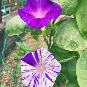 今日のお花アサガオ✨ 昨年種蒔きして育てて種も取っておきましたが溢れ種が大量に発芽しました💦沢山お嫁に出しましたよ〜👰♀️ 昨年は下手くそ過ぎたネット張り。今年はピンっと張れました⤴️今朝は暑過ぎて⁈毎朝チェックするのだけれど9時頃でくったりですが💦この品種はこんな感じに柄違いが咲くのでお得感あります🉐来年は水色のアサガオも欲しいかな❀.(*´◡`*)❀.🩵
