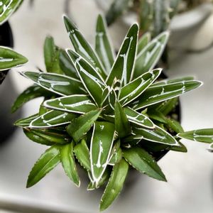 アガベ属 姫笹の雪 ✨️✨️ 今日は朝から雨☔️ 雨ざらしコーナーの笹の雪ちゃん🎶 遮光コーナーに置いているせいかダメージなし👍 今年の夏は暑いは乾き悪いは雨降らないわで成長ものんびり😅 子株は春に取るかな〜🥰 🏷かずの姫笹の雪