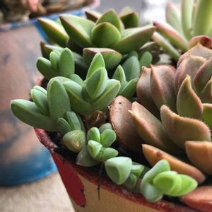 現在、大規模修繕中の我が家。 いつもはベランダで植物を育ててますが、今は基本的には室内管理しています。 一部大きな鉢や寄せ植えはマンションの共同の植栽置き場へ移動させて早1ヶ月半。 かなり水を切って育ててきたのが雨ざらしになって、全体的に驚くほどモリモリになってます💦💦 何年も前に寄せたもので名前を忘れてしまったものもあります。教えてもらえたら嬉しいです。