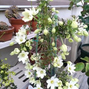 クレマチス カートマニージョー 4年目 去年の花終わりに 鉢増しして🪴 伸びた枝を少しカット✂️ 今年は半分こんもり 半分は伸びた枝に咲いて〜 よく頑張りました👏👏👏 そして5枚目は 4年目のペトリエイ 😭😭😭😭😭 去年は めちゃくちゃ花が咲いたのに 冬に葉が白くなって 新芽が伸びず😭 今年の花はこれだけ💦💦 なんでかなぁ 病気?やったんかな😆 もう少ししたら 根っこチェックしてみよう✅