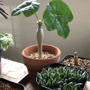 丸々したジャガイモみたいな塊根に、切れ込みのあるカッコいい葉っぱ🍀 オマケに真っ赤の花が咲いて三拍子揃った塊根植物です😊