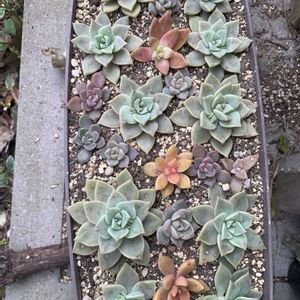 伸びすぎた多肉や葉挿しから大きくなったものを集めて寄せ植えを作りました💚胴切りや残りの葉はポイポイ鉢へ 基本雨ざらしです