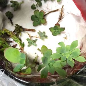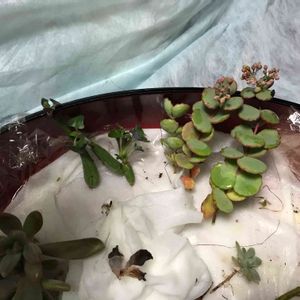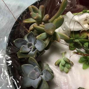 多肉ちゃん盛り合わせ分けていただきました🤗 がしかし知識のない私には全く名前がわかんない💦 左下の多肉ちゃんは朧月でしょうか? みなさま教えてくださーい😭