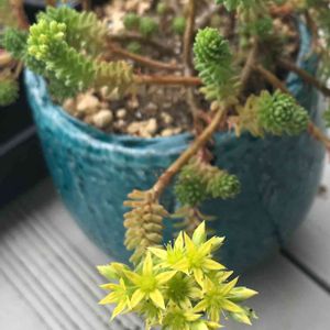我が家の「小松緑」に初めてお花が咲きました🌼 先端に小さなお花が沢山咲いています🌼 まだ、蕾もありますね🎶 「小松緑」は、多肉植物の茎が、木化したようになり表面が乾燥し茶色くささくれ立ってきて、小さな松のようになるのですが、うちの小松緑はまだまだ多肉っぽいです😆