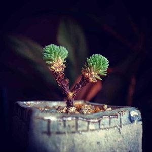 ミニ多肉植物 四人衆 (チレコドン、般若、アガベ 、小松緑) 右奥の小松緑は先日のビッグバザールで仲間入り。セダムのくせに和風な雰囲気を纏ったイケメン君🤩 アガベ も少しずつ育ってるしチレコドンも葉を出してきた✨ 般若くんは…まぁ相変わらず。