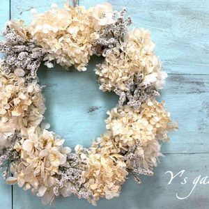 漂白したアジサイやアナベルと白いスターチスのドライを使ったリース。 去年の茶色になった花を漂白剤とグリセリンを使って、加工しました。真っ白にならなかったけど、これくらいでもいいっかな。 花が傷んで、ハラハラ落ちるので、ヘアスプレーをかけて定着させました。