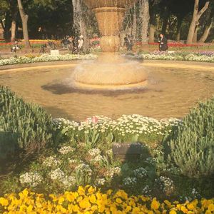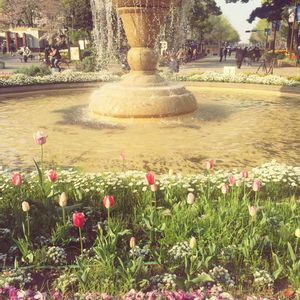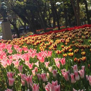 関内。横浜公園。スプリングフェア2016。 赤い靴の女の子像の背後に咲くチューリップ達…。