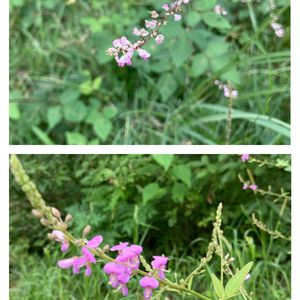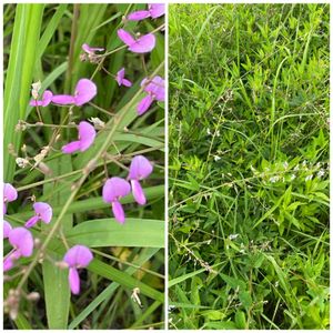 ハギ 萩かしら アレチノヌスビトハギ 夏に休耕田の田んぼの草を刈ってくれてましたが、又復活してます💚 左側はpm1:00頃 右側はpm 3:00頃 葉っぱを写そうともう一度行くと曇ってきてましたので早くも生気がありません💦💦💚 狐🦊にツママレタ気持ちになりました💜 またまたすずはなさんに教えてもらいました💓🌸