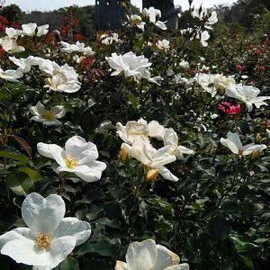 「未投稿 バラまつりの薔薇🌹 最終」 県農業公園 カントリーパーク バラ園🌹で撮影📱 ホワイトノックアウト🌹 奥の建物はバラ園🌹 にある展望台 撮影場所 県農業公園 カントリーパーク 撮影📱 2020.10.11