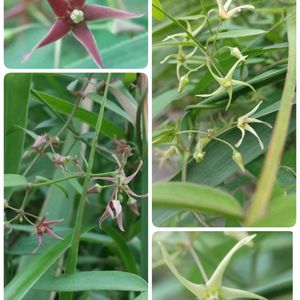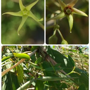 黄緑色の妖精アズマカモメヅルの花がようやく咲き始めました、皆でダンスをしているようです🤍💚🌿 日本固有種で希少な絶滅危惧種に指定されています。 蔓性で星形の花びらの先端がプロペラのように捻れています。 花径 7mm〜12mm位 キョウチクトウ科 カモメヅル属 🏷珍しい山野草