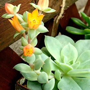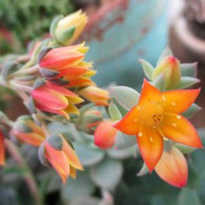 多肉のお花(*´ω`*) いま、うちのベランダは、ハイビスカスや、ゼラニウム、カーネーションなどの赤色のお花ばかり咲いているので、違う色のお花は多肉だけです♪ 右の花…ファンクィーン 左の花…アエモナ