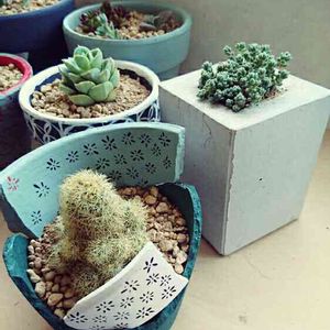 割れた鉢をリメイク第2弾。 今回は緑と白に塗って変な模様を描きました。 コンクリ鉢は穴小さすぎて何も入らなかったので、 フォロワーさんの意見を参考に セダムのブレビフォリウムを植えました(*˙︶˙*)