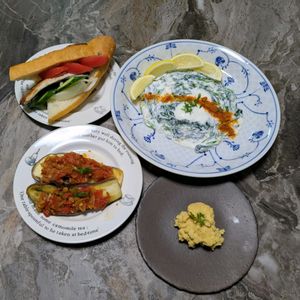 お🌸で無くて ごめんなさい… トルコ料理です😊 左上から サバサンド 右上 ヨーグルトとほうれん草の前菜 右下 フムス(ひよこ豆のペースト) 左下 イマム バルドゥユ(坊さんの気絶) ヨーグルトにチリペッパーを かけたので「今日のお花 トウガラシ」と 言うことにして下さい🙏 塩分が 殆ど無くてヘルシーです サバサンドは、トルコのB級グルメ🤭 「クミン」さえあれば、トルコ料理っぽく なります…😅