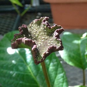 これはキノコ🍄ではございません! 白い点々に花が咲くらしいです🤔 昨日 オザキフラワーパークに土を買いに🚲 店内で この植物が目にとまり黒い物好きの私は動けなくなり購入してしまいました💦 ブラジルの雑草だとか?😅😆 テカテカの綺麗な大きな葉 こぼれ種で繁殖するらしく なるほど雑草と言われても納得。 土だけ購入のはずが両手には植物がたくさん💦 🚲前カゴに入れた長〜い風鈴ブッソウゲに視界を邪魔されながら自転車をこぎ 無事帰宅💦 楽しかったよ〜😆