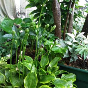 蛇さんのように横向きにのびていたほすたの花茎が、上を向いてどんどん伸び始め、蕾をつけ出しました。 いただきもののホスタさん、白っぽい?楽しみです。