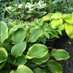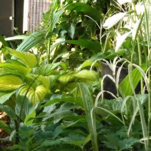 頂きものの筋ギボウシ?下の葉は白い葉に筋が見えるのに後から出た葉は緑です🤔?その子が緑のへびさん?どこに向かっているのかな?