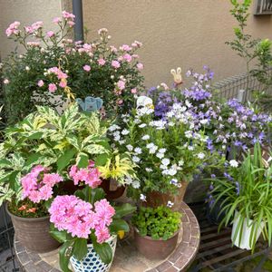 おはようございます♪ 今日は朝からムシムシ! ❶ガーデンテーブルの上が賑やかになりました〜 「ミニバラ」は10年以上前に娘から母の日🎁 「ウレイシア」は4月にお迎え、次々と咲いてくれます❣️ 「斑入りヘンリー蔦」は苔玉から鉢に植え替えたので例年よりも元気にツルを伸ばし中🌿 ❷「カンパニュラアルペンブルー」と「アルペンピンク」が仲良く満開。 これも12〜3年生🩷💜🩷💜 「アルペンホワイト」は⭐️に…