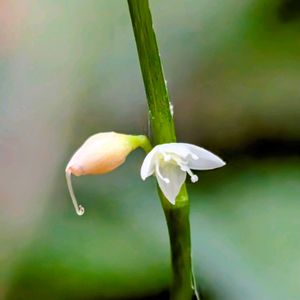 ミズヒキ 林の縁で白いギンミズヒキに出会った GSの今日の花♬ 閉じた萼片から何やら出ているのは雌花だという➰ 柱頭の先が2つに分かれたこの姿に出会うことが圧倒的に多い♡♥♡ 雨上がりの庭で、珍しく花弁の開いた花に出会い、こちらからは飛び出した雄しべが見えていた🟥 薮にワサワサと生えていて、つるに巻きつかれていたり、ワレモコウが倒れてきたり(๑´∀`๑)🔴