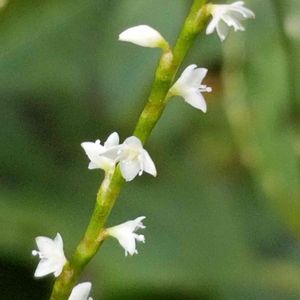 ギンミズヒキ(銀水引) 別名 シロミズヒキ(白水引) *タデ科イヌタデ属 花期は8〜10月 全国の林縁や林内、道端等で見られる。 ミズヒキの品種で花被全体が白色のもの! 直径3〜4mmの小花を横向きに付ける。 花被は4裂し、雄しべ4〜5個 花柱は先が2裂しかぎ状に曲がる! 8月26日撮影 自宅付近