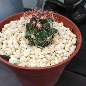 緋花玉 数年前に100円の見切り品として購入。 真冬は室内で、3月から外で頑張ってもらいました😅 ちょっと萎んで、色も茶色になってヤバいかなと思ってたら、初めて蕾が付きました🎉