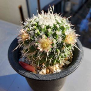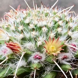 Mammillaria karwinskiana (マミラリア カーウィンスキアーナ) なんとも難しい名前のサボテン 和名は 白蛇丸(はくだまる) 白蛇丸はマミラリアの中でも数少ない分頭によって群生していくサボテン 子株のうちは とても丸く可愛らしいけど 成長すると 恐ろしさを感じるほどの 姿に変貌する そんな 白蛇丸🐍 花冠になりました😁