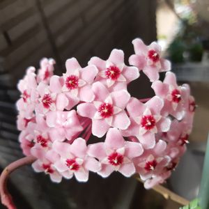 ホヤ カルノーサ リップカラーの挿し木苗を一年まえにGSの方から頂きました😃植え替えして育てていましたがまだ鉢増しはいいかな?と思っていたのですが 今日見たら⬇️花芽がついていて ↖️の状態で花が咲くのは厳しいものがあるなぁと思い 植え替えしないで行灯仕立てにする方法を考えました😄 一回り位大きい鉢の中にすっぽり入れ 朝顔の支柱を鉢と鉢の間に入れて ↗️このようになりました😄 この後ツルの先をもう少し誘引しました😃 いつでも咲いていいよ😄