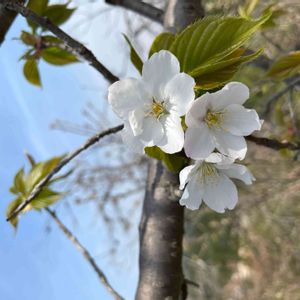 大島桜だと思われます。 葉が出てきてから咲くサクラ。 白くて、シベが黄色かな。 少しだけ咲くのもかわいい♫