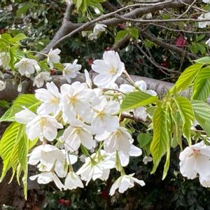 植物園のオオシマザクラ(大島桜)です。 純白の一重咲きで 葉っぱが花と共に展開するのが特徴です。 葉っぱにはクマリンと言う香り成分が含まれており 塩漬けにして桜餅の葉に使われることから"もち桜"とも呼ばれているとか…。 桜餅が食べたくなりますね。 伊豆諸島 房総半島など日本原産。 バラ科サクラ属の落葉高木。