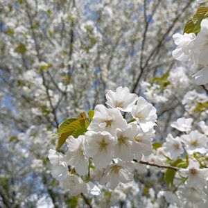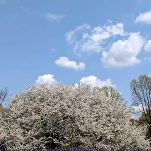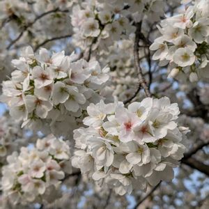◯大島桜‥かな?◯ 歩道脇の桜並木にソメイヨシノの中に混ざって植えられてました。 多分、大島桜かなと思いますが、山桜の可能性もありかも。 花は真っ白でこれはこれで清々しい✨大島桜は伊豆諸島に自生する野生種で、葉っぱは桜餅を包む葉とのこと。ソメイヨシノより葉が少し大きいそうです。