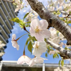 桜 その7 ベランダから眺めていると、ピンクのソメイヨシノとは違って白い桜の木があるのに気が付いたので見にいきました❗️ 葉っぱも一緒に出ているのでオオシマザクラではないかと思います❣️ 違っていたら教えて下さい。
