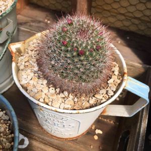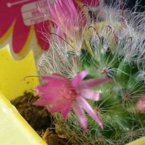 100均で、ピンクの花が着いたちっちゃなサボテンを買いました。 ふわふわなうぶ毛に カギ状のトゲがあります。 わかる方名前を教えてください。