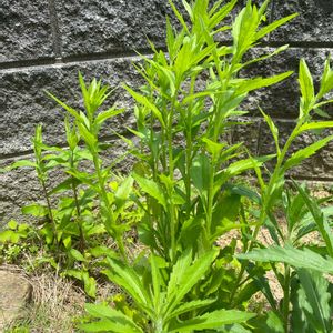 大荒地野菊 オオアレチノギク キク科 ムカシヨモギ属 原産地 南アメリカ 日本では 本州以南 花期 7〜10月 草丈 1〜2m以上 日本には昭和初期に帰化した。 秋に芽生え、冬の間はロゼットで越冬する。 夏に茎頂に多数の頭花を形成する。 舌状花は淡褐色で小さく外からは見えない。 キッチンの窓外でユラユラ風に揺れています。撮ってほしいと言わんばかり。 しっかり撮りました。 写真① 地味な花です。 写真② 種が風に乗って飛んでいきそうです。 写真③ 花 全体 写真④ 葉の様子 写真⑤ 花の時期に根生葉が残っていますね。