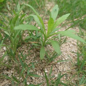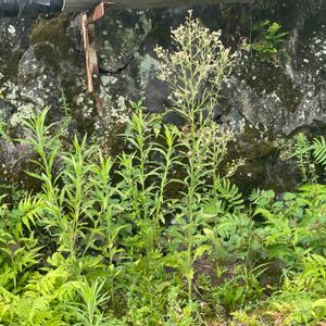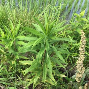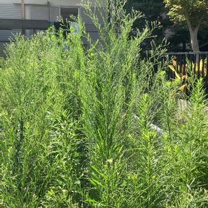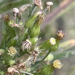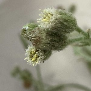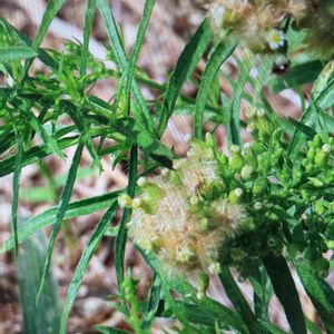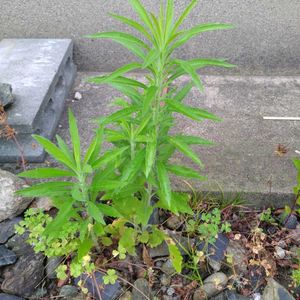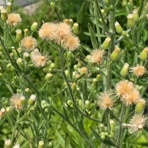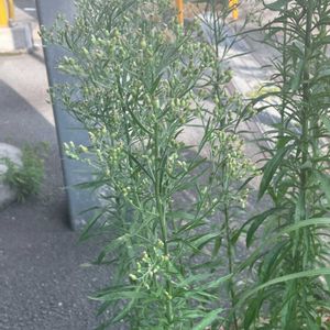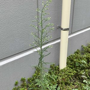 オオアレチノギク(大荒地野菊) キク科イズハハコ属の植物の一種。 種小名は「スマトラの」という意味である。 オオアレチノギクは南米原産。 1920年前後に入り、先に(1890年前後)渡来したアレチノギクを駆逐しながらほとんど全国的に広がった。 和名は大形の荒地の野菊の意。 花の特徴 花序: 茎の上部に円錐状に多数の頭花をつけます。(1〜2mの丈) 頭花: くすんだ白色から淡黄色で、長さ約5mmです。舌状花は小さく、総苞の外にはほとんど出ないため、花弁がないように見えます。 ロゼットの特徴: ①色合い:白っぽい緑色(白っぽく見えるのは毛のせい)。 ②葉の形:葉は細長くやや浅い大きめな鋸歯。 ③毛:白色の短毛が葉全体にはえ、手で触ると少しふわっとした感じがします 📝: ヒメムカシヨモギは9/2投稿