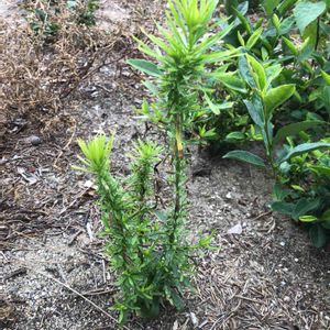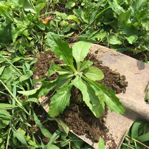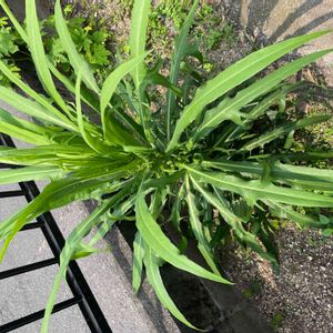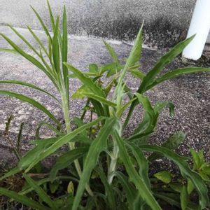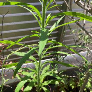 オオアレチノギクだと思います。 私と同じくらいの高さまで伸びてます。 綿毛をこぼしているのは、朝顔の葉。 どうやら支柱にされているらしい😁