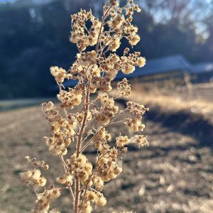 2/10 山散歩🥾 いまは本当に何もない時期ですね、見慣れたもんしか無いですけど、なんとなくの山の賑わいです😍 小さい冠毛がビッシリとまとまっています。全体の姿からは、外来種のオオアレチノギクの冠毛だと思います。 野菊というよりヨモギの仲間と言った方が分かりやすいですね。キク科ムカシヨモギ属の仲間でよく似たものに、アレチノギクやヒメムカシヨモギがありますが、アレチノギクは側枝がよく伸び、ヒメムカシヨモギは花序が箒状に広がることが多いのに対して、オオアレチノギクの花序は円錐形になります🤔