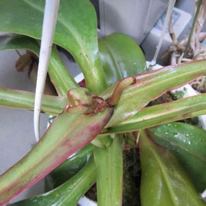 N.トランカータの新ピッチャーはほぼ完成しました。後はリップがもう少し巻き上がる他は色づくのを待つだけです。 トランカータはあらゆる動きが遅いのんびり屋な品種ですが、蓋が開いてから完成するまでの時間も地味に長いんですよね。夏休みの自由研究には不向きだと思います。新芽が出てからピッチャーの完成まで3ヶ月もかかるので途中で夏休みが終わります。ホームセンター等で販売されているウツボカズラはこんなにスローペースでは無いのでご安心下さい。