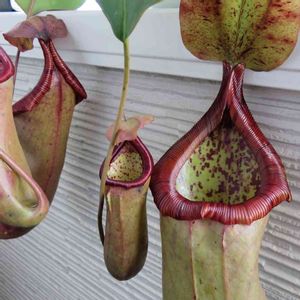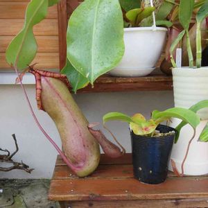 N.トランカータは購入してから初めてつけたピッチャー(鉢の上で後ろを向いているやつ)が枯れ始めました。蓋が巻き込み始めるという前兆が出ています。いずれそうなるとはわかっていましたがいざそうなり始めると寂しいものです。ただ、トランカータのピッチャーは上半分まで枯れてからが長いのですぐに切り取ったりはしません。 大きさの参考までに鉢は4号、左下の温湿度計は浜田山集会でたまにじゃんけんに供されるものと同じ大きさです。