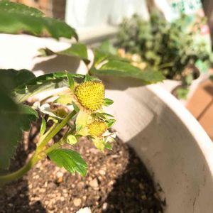 おはようございます☺️❤️ 大阪は気持ちの良い秋晴れです🌈 白イチゴのエンジェルエイト。 ふたつ目のお花が咲き始めました🌸 ひとつ目は、 ここから膨らんでくれたら嬉しいです🍓