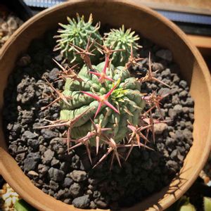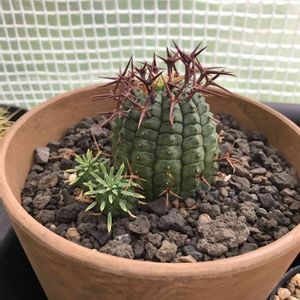 ユーフォルビア、群星冠。秋星冠と違って春にしか棘を出さない群星冠。今期の棘は終わり……と思ったら、なんだか大きい棘が出てきた。