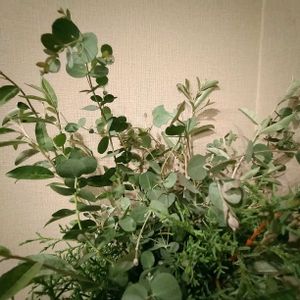 近所のスーパーでスワッグ用にとユーカリ等の枝が売っていたので。柑橘系の香りと合わせて玄関がいい香りです。