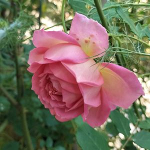 マダム アルディー 明るい半日陰 花つき良好。ヤマボウシの枝を利用して、長く伸びる枝を誘引 ヤマボウシの白い花(総苞片)と一緒に北側を明るくしてくれてます