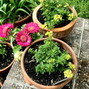 今朝のペチュニアライム🍋🟩 新芽が増えてきました😊 花色に少しオレンジ🧡が混じってきました🍊 このところ日中の陽射しが強くて焼けたかな😅 1️⃣応援団員のガーベラさんと☺️ 2️⃣3️⃣一鉢ずつ📷 4️⃣ニオイバンマツリが咲きました😊 父が大好きだった花です。 他界して一年。今年も咲いたよー☺️