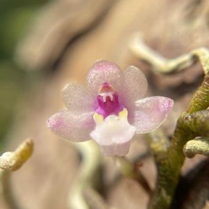 Pelatantheria scolopendrifolia. とっちも小さいムカデランの花が咲きました🌸 本当に小さい、でもしっかりした蘭花、とっても可愛いです。 花弁はシルクのような輝きがあるような透明感のあるような不思議な感じがします。 見た目も特徴ありますよね。 板に着生させてグングン育ってます。 枝分かれしないのかな?