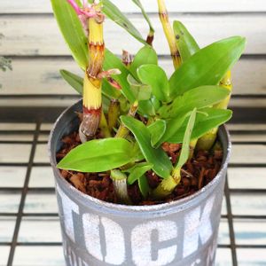 義実家🏠️から 義父が生前育てていたランの一番小さい鉢植えを貰ってきました。 ランには似つかわしくありませんが💦空いてたリメ缶にヤシの実チップ(ベラボンプレミアム)で植え替えました。 ランの名前が解れば教えて下さい🙇 〈追記✏️〉 Instagramでデンドロビウム・ノビルと教えて頂きました。