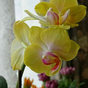 今朝水遣りをした時には蕾だったミニ胡蝶蘭。 今見ると…咲いていました(*´˘`*) グリーンがかったイエローなんです。 これも好きな色〜