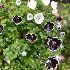 教えて下さい。 葉は、大根の葉っぱみたいです🌿 花は、黒に近い 濃いエンジです。 ※。.:*:・'°☆ 教えて頂きました。 ネモフィラ で タグで調べてみたら ネモフィラペニーブラック みたいです。