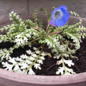 見元園芸さんのネモフィラ プラチナスカイ☺︎ 名前の通り葉っぱがプラチナのようなシルバーリーフ♡花がひとつぽつんと咲く姿が可憐です(。ᵕᴗᵕ。)