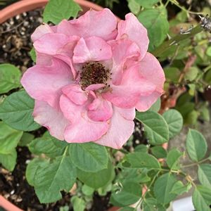 この子ずっと外の網棚に。 たまにお水やるくらいで。 最近ぽつ、ぽつ、、と 咲いてくれてて、 今朝みたら なんと蕾入れて4つも!! この子の気持ちを感じて 植え替え、 室内へ。 いい感じです。 咲いたお花の直径2.5cmくらいのミニバラです🥰