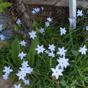 レンガの隙間に植えたハナニラです。 一輪だけ真っ青が咲きました。